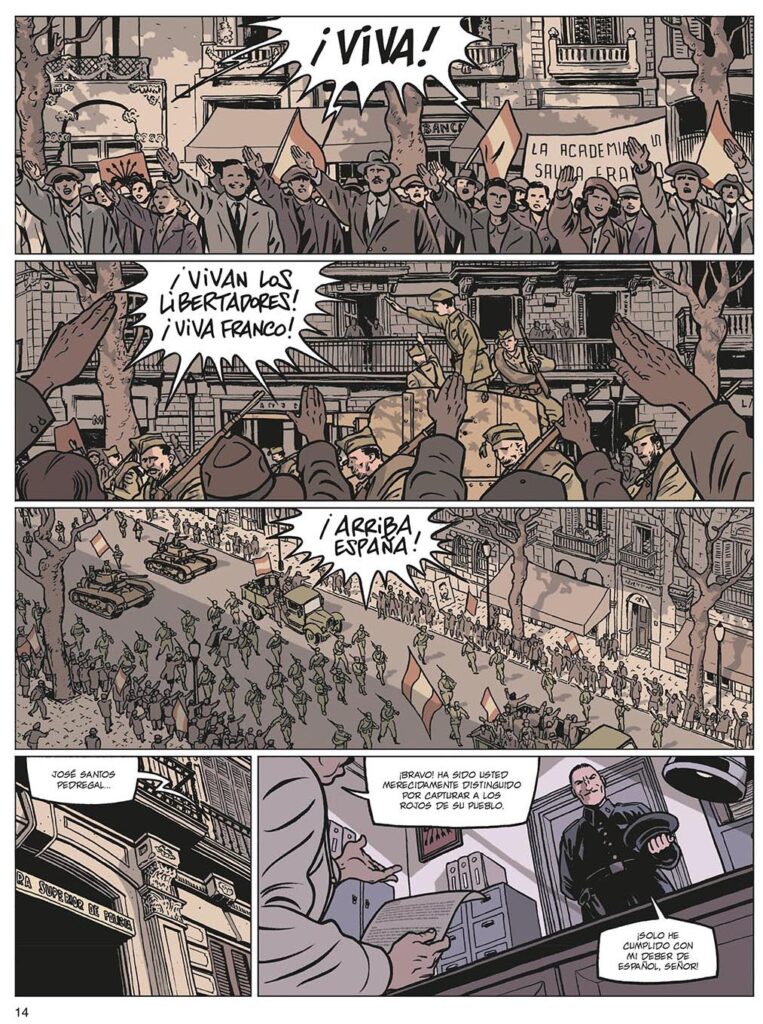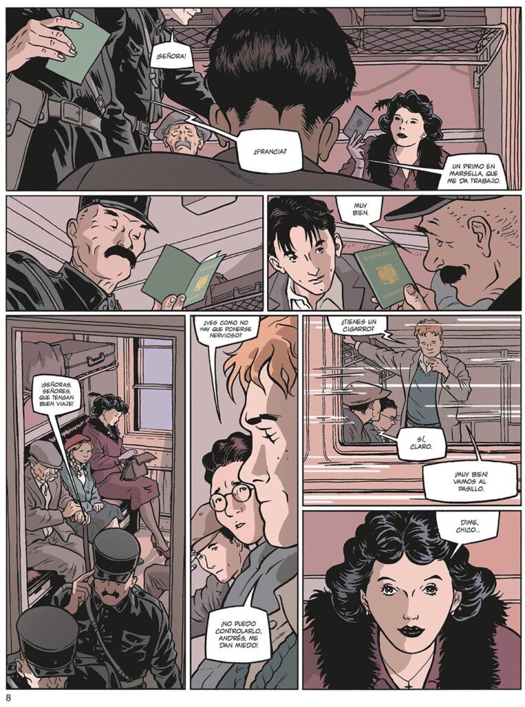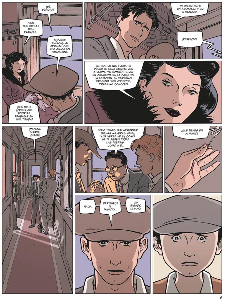 Visualmente, el trío formado por Pellejero, Torrents y Pardo nos deja boquiabiertos ante el inicio del relato en 1948, en la Estación de Francia. Juntos, sus detallados dibujos dan vida a una extensa galería de personajes, todos interesantes y bien perfilados, colocados en otros tantos espléndidos escenarios urbanos de Barcelona donde se reconocen edificios modernistas y calles aún preservadas hoy como hace décadas. Pero volviendo a la versión más luminosa de esa obra de ingeniería que es la estación de tren, iniciamos viaje vital junto a Carlos Moreno, protagonista máximo de este Barcelona. Alma negra, verdadero testimonio ficticio a través de tres décadas reales de lo que fue la vida del español de a pie en la posguerra que marcó con miseria tantas vidas bajo el yugo de la dictadura franquista que veremos pasar por estas páginas en todos los sentidos. En ese tren, Carlos Moreno viajaba a la vecina Francia tratando de encontrar, como tantos otros compatriotas, el futuro que en aquella España resultaba tan difícil encontrar. Es en ese mismo tren, camino de Perpignan, donde conocerá a Jocelyne, la generosa dueña de una tienda que allí mismo le ofrece trabajar para ella. Sin darnos tiempo a ser conscientes de que el guión ya nos ha atrapado, en ese momento Lapière y Jakupi nos adentran del todo en un libro que ya no podremos soltar hasta leer la última página, porque el detalle de una herida en la mano de Carlos nos conduce a que éste recuerde de golpe toda su infancia y parte de su adolescencia hasta el momento que le llevó a coger ese tren.