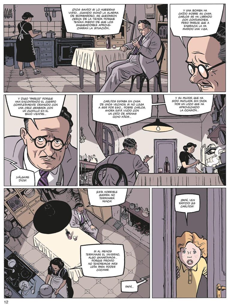 Es ahí donde los guionistas le ponen en bandeja en especial a Rubén Pellejero dibujar un relato que tiene tanto de histórico como de policíaco y genero negro en estado puro, un género en el que sin duda Pellejero es maestro dibujando las sombras que perfilan el lado más oscuro de algunos personajes, aunque el resultado final es, indudablemente obra de los tres dibujantes involucrados. Y es que Carlos, cuando de niño era Carlitos, sufrió el final de la Guerra Civil con los últimos bombardeos sobre Barcelona perdiendo a su madre pero no víctima del azar, sino a manos de un sádico asesino de mujeres cuya sangrienta marca seguirá al joven a lo largo de toda su vida, enrevesando lo que podría haber sido un relato costumbrista sin más y convirtiendo Barcelona. Alma negra en una feroz y dinámica trama repleta de personajes interesantes, otros inquietantes y muchos de ellos pintados con la oscuridad debida a quienes abusaron de su poder de gorra fácil durante la dictadura.