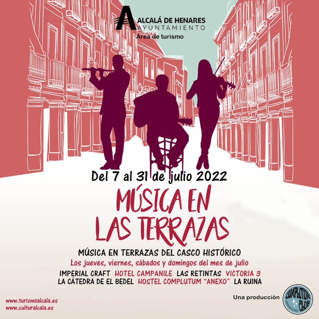 Surge «Música en las Terrazas» en 2017 con la intención por parte del Ayuntamiento de Alcalá de llenar de cultura cercana las noches huérfanas de julio y ofrecer además a los hosteleros de la ciudad una opción para reclamar público estival con una oferta rica, variada y divertida. Qué mejor que música para aliviar los calores en la compañía amiga y de un refresco o una cerveza y una tapa o una cena, ritmos que sin refrescar lo pretenden y permiten cerrar las noches estivales con una sonrisa rítmica y cómplice.