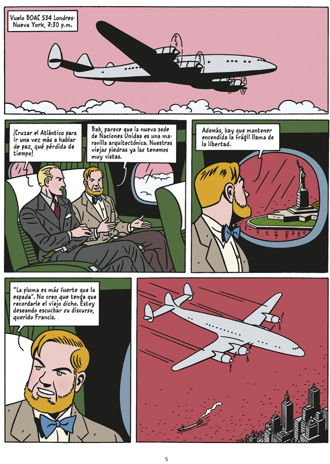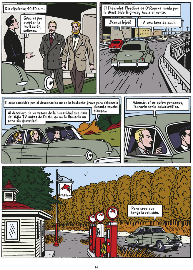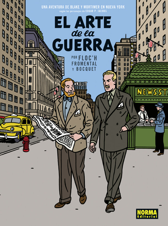 Pese a sus reticencias, no podía haber autor más acertado, adecuado y preciso que Floc’h para darle una nueva visión a un cómic que parece un clásico editado en la época de Jacobs. «Siempre había dicho que no me interesaba hacer un Blake y Mortimer -reiteró el dibujante en sus primera entrevistas promocionales sobre este libro-, que estaba en la tierra para ser Floc’h, no Jacobs. Después de haber hecho autoficción todos estos últimos años y haber acabado dos obras al inicio del confinamiento (La Femme de ma vie y Une chienne de vie), se abrió un hueco y me lancé a esta aventura nacida probablemente de un espíritu de contradicción, en definitiva. Llamé a mi viejo cómplice, Jean Luc Fromental, con quien firmé Jamais deux. sans trois, y que conoce perfectamente mi manera de hacer las cosas. Me dio su acuerdo con la condición de trabajar con su socio, Bocquet«. Y así fue posible Blake y Mortimer. El arte de la guerra, una aventura neoyorkina escrita a la medida de Floc’h por una pareja de veteranos guionistas igualmente culpables de una obra que lleva el universo de Jacobs hasta sus últimas consecuencias, incluida la radicalidad del evidente exceso intencionado en el uso de la línea clara por parte del dibujante, que logra hacer de algunas páginas y viñetas verdaderos cuadros con sabor a arte pop completamente retro pero de una elegancia de la que muy pocos autores son capaces.