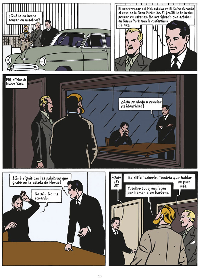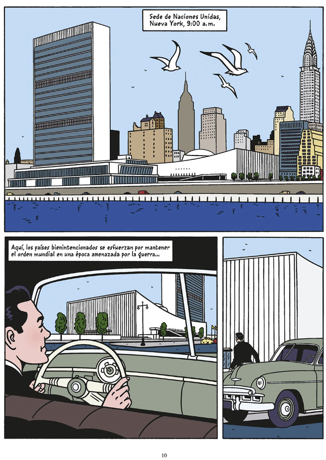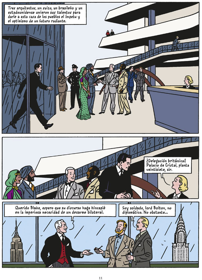Blake y Mortimer. El arte de la guerra es todo un homenaje a dos personajes que escribieron su lugar en el olimpo del cómic europeo con grandes aventuras ambientadas en el viejo continente. Quizás por eso Fromental y Bocquet nos llevan a asistir a un apasionante relato de misterio en la ciudad de Nueva York a principios de los años 50 del siglo pasado, en plena Guerra Fría. Francis Blake, acompañado por Philip Mortimer, es invitado a dar un discurso en la sede de las Naciones Unidas neoyorkina. Muy ágiles en la narración, apenas los dos héroes desembarcan de su avión, un personaje misterioso, es arrestado después de haber destrozado una reliquia egipcia expuesta en el Museo Metropolitano. Trastornado y aparentemente amnésico, este último es internado en una clínica especializada. La mayor de las sorpresas llega cuando el detenido resulta ser el mismísimo Olrik. Rápidamente informados de la reaparición de su némesis, Blake y Mortimer ofrecen su ayuda al FBI. Con su archienemigo cerca y la cumbre de Naciones Unidas como posible escenario de nuevos desastres a escala mundial, los personajes acaban completamente involucrados en una historia que, en esta ocasión, tiene más de thriller al estilo de Alfred Hitchcock que de aventura repleta de acción. Quizás por eso esta versión de Blake y Mortimer es especialmente entretenida e intensa.