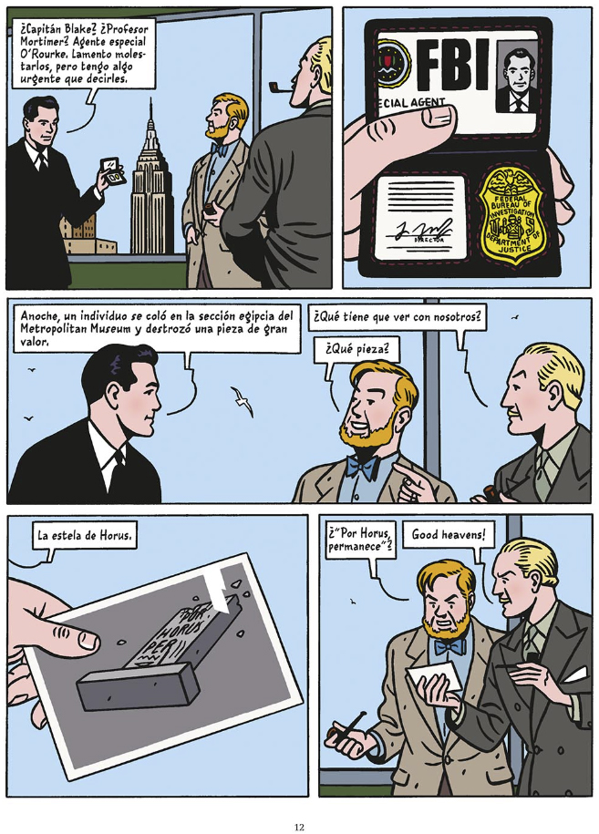 Pocas series y personajes hay más emblemáticas del cómic franco-belga que Blake y Mortimer, la creación eterna de Edgar P. Jacobs, de quien Norma Editorial inició la titánica labor de editar en España unos increíbles tomos integrales cuyo segundo tomo estará al alcance de nuestras manos al final de este mismo verano. Mientras tanto y aparte de la obra original de Jacobs, sus personajes son de esos mitos universales de la viñeta a los que les está permitido acercarse a otros autores, enriqueciendo visualmente historias que verdaderamente merece la pena disfrutar siendo aficionado a los personajes originales. Lo más curioso es poder disfrutar de nuevas aventuras de estos héroes inquebrantables tras la detallista e impresionante versión que de ellos nos ofreció antes el mismísimo François Schuiten con El último faraón, ya que la diferencia gráfica entre ambos autores no podía ser más abismal. Y de las detallistas líneas de Schuiten pasamos a Floc’h, el más puro representante actual de la denominada línea clara en un arriesgado ejercicio de renovación que sorprende y va más allá de todo lo esperable.