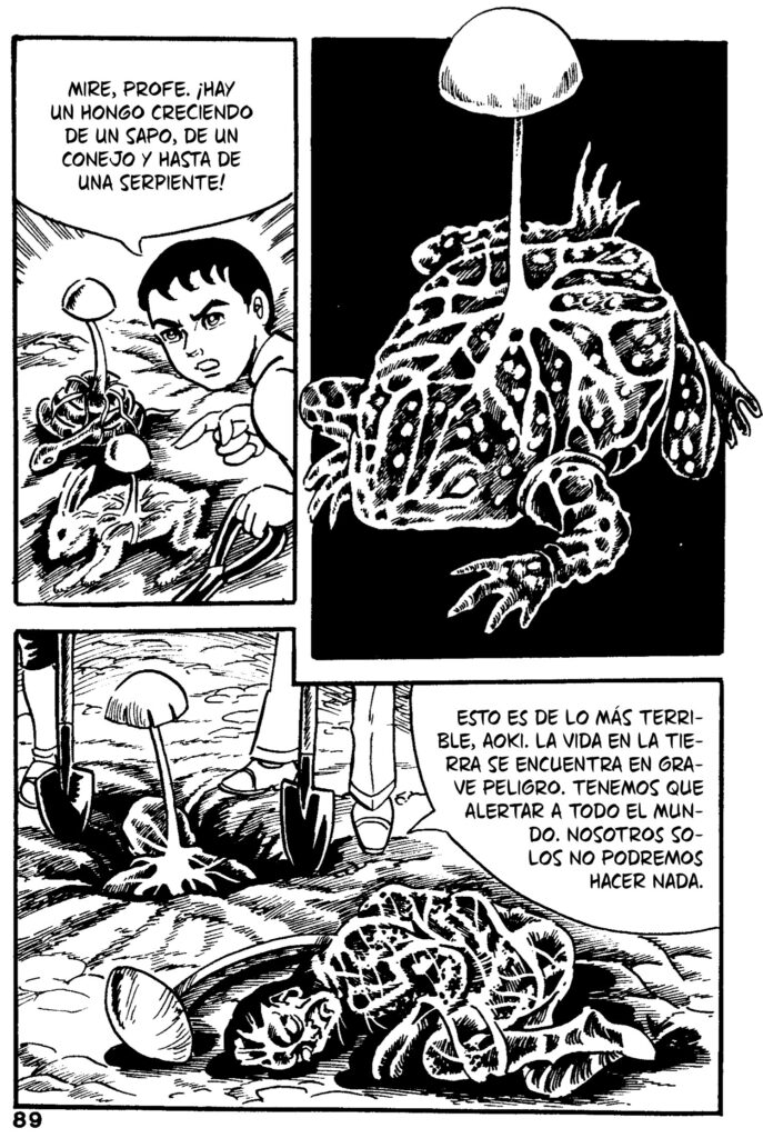 Lo cierto es que en esa insistencia sobre un género que obviamente le fascinaba como a tantos otros amantes de lo oculto, misterioso e igualmente de lo fantástico, llevó al autor a elaborar un relato gráfico que, aún hoy en día, resulta tan emotivo, atrayente y, posiblemente inolvidable, como lo fue hace casi cinco décadas. Aunando sus profundos conocimientos sobre folclore japonés y sus leyendas sobrenaturales, Shirakawa creó inconscientemente uno de los grandes clásicos de culto en el mundo del manga y una inolvidable marca imperecedera dentro de un tema reiterado en numerosas ocasiones en las historias japonesas como son las historias de hongos. De inmediato al aficionado y seguidor del terror nipón le viene de forma inmediata a la mente un nombre como Junji Ito. Y lo cierto es que, bajo la aparente inocencia del sencillo y amable trazo de Shirakawa descubrimos una obra a la vez merecedora de figurar entre los grandes del terror clásico al ser capaz de lograr que realmente la lectura de La invasión de los hongos del espacio sea inquietante tanto por lo que leemos y vemos como por lo que nos lleva a imaginar.