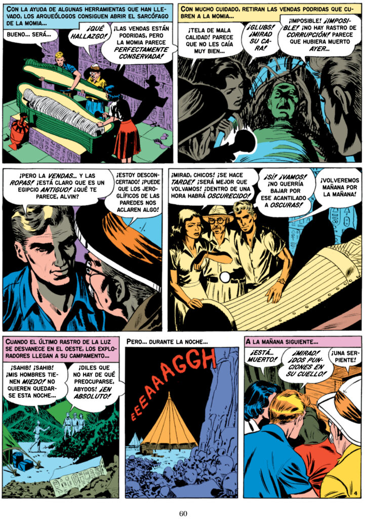 Con una nitidez en las planchas y una pulcritud al borde de la perfección en la edición, el color y todo lo que rodea físicamente este tomo, acompañan una serie de historias cortas que enganchan, aturden, entretienen y, sobre todo, asombran. Y es que en narraciones ilustradas como A flor de piel, La huerfanita, Tú, asesino, la lista de autores es tan espectacular como la presencia de Frazetta: Johnny Craig, Al Feldstein, Wally Wood, Harvey Kurtzman, Graham Ingels, Al Williamson, Reed Crandall, Bernard Krigstein y un largo etcétera, son también nombres míticos en la historia del cómic y que nos han acompañado en infinidad de páginas en otras muchas series recuperadas por Diábolo como este volúmen.