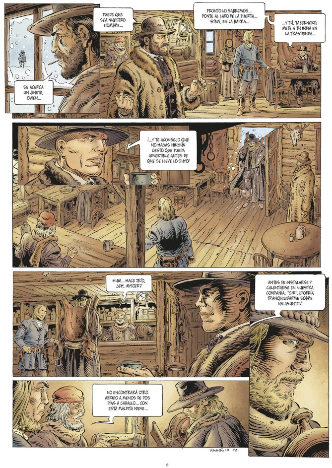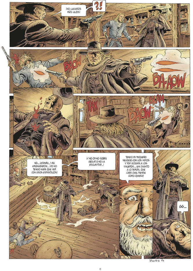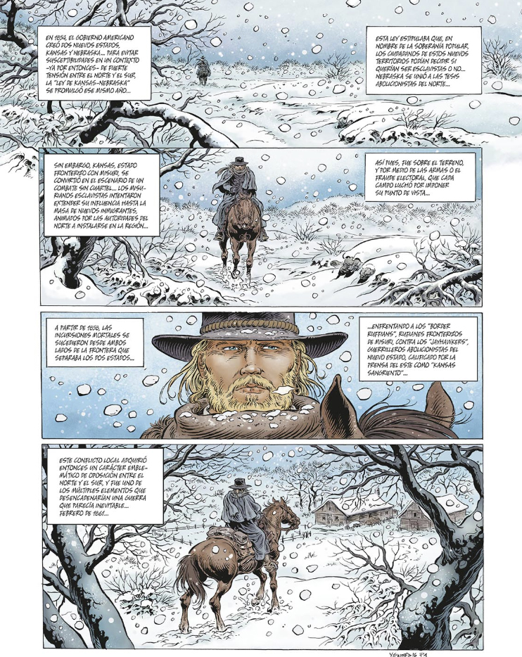 El período elegido por Yves Swolfs, autor completo y experto narrador que nos atrapa desde la primera viñeta, no podía ser más convulso y repleto de posibles tramas sobre las que perdernos a través de personajes, principales, secundario e e incluso villanos, con los que empatizamos desde sus primeras frases. Estamos en el invierno de 1854, a pocos meses de que, de forma completamente inevitable, estalle en Estados Unidos una fatídica guerra civil entre el norte unionista y el sur confederado. Ayudado por detalles reales que, como suele pasar, superan cualquier ficción, infinidad de grupos armados en una tierra que aún hoy es igual de salvaje e impredecible, atizaban el conflicto desde los estados limítrofes que separaban a quienes luchaban contra la esclavitud y quienes defendían un método de vida donde aquello era simplemente su forma de vida. En la ficción, el cruel predicador Markham y su grupo salvaje azuzan el frágil equilibrio del momento sembrando odio con atrocidades a lo largo de las poblaciones fronterizas entre Kansas y Misuri.