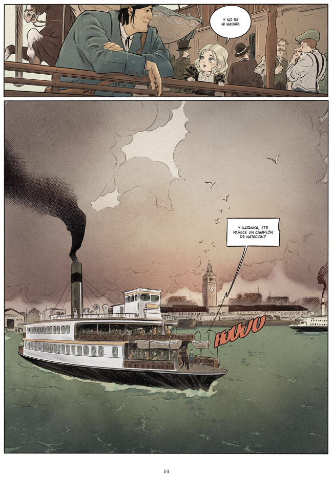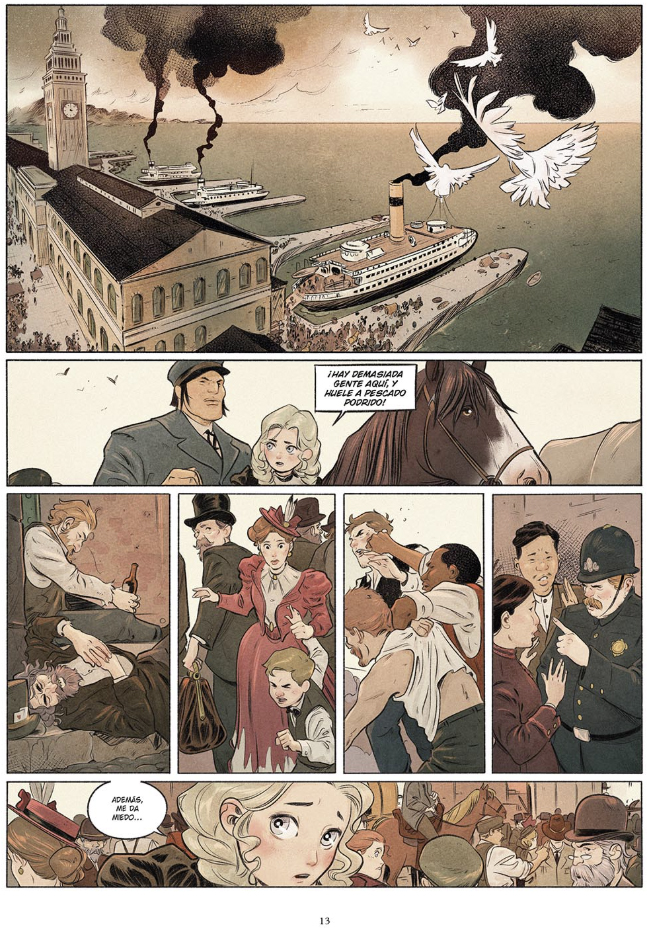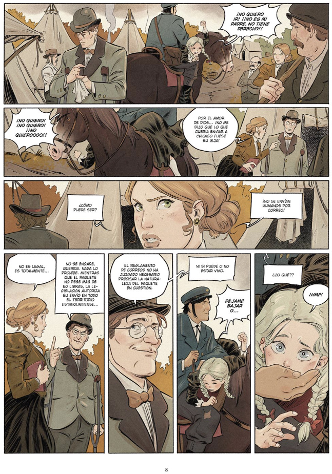 Es curioso como, aunque ambientada esta segunda historia muchas décadas después de nuestra anterior recomendación, en concreto en 1906, el viaje que nos proponen por esos mismos Estados Unidos el guionista Bertrand Galic y el ensoñador dibujo del artista Roger Vidal, coincide en los mismos detalles y abismos culturales e históricos que dividían entonces y aún lo hacen ahora a la enorme nación norteamericana. La niña y el cartero comienza en un país supuestamente más civilizado, que dejó atrás el enfrentamiento fratricida con las grandes libertadas ganadas para todos… o al menos en teoría. Como muchas grandes historias, ésta nace de las ruinas de un drama real como fue al gran terremoto de San Francisco, que nos lleva a una situación realmente peculiar. Y es que, habiendo perdido la pequeña Jenny Bridge a su madre en la tragedia, quien aparentemente es su padre, se niega a hacerse cargo de ella y decide enviarla a la casa de sus abuelos paternos, que tienen un rancho en Illinois. La forma de hacerlo: acogiéndose a las difusas leyes del servicio postal, como si fuera un mero paquete… «nada lo prohíbe -explica el gélido personaje que encarna al padre-. Mientras que el paquete no pese más de 50 libras, la legislación autoriza su envío en todo el territorio estadounidense. El reglamento de Correos no ha juzgado necesario precisar la naturaleza del paquete en cuestión. Ni si puede estar vivo o no».
