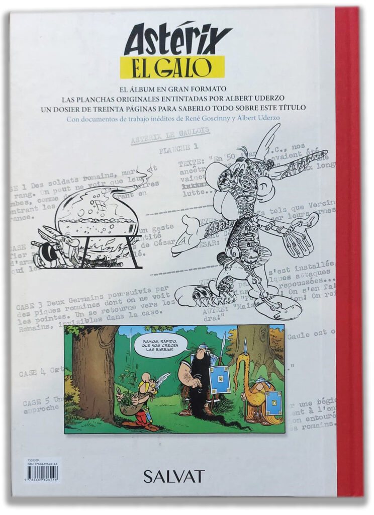 Incluso cuando el aficionado a Astérix ya tuvo la suerte de poder hacerse en castellano con los espectaculares tomos de La Gran Colección, esta edición de lujo es aún más vistosa y resulta imposible pasar por delante de ella sin acercarse a curiosear su interior. Con un tamaño aún mayor que los volúmenes de La Gran Colección, que de por si eran enormes, Astérix el galo se presenta en espectacular formato 26,5 x 37 cm., con lomo entelado, tapas duras y dos tipos diferentes de papel en su interior: papel estucado de alto gramaje en el que se puede disfrutar de la primera aventura del inmortal personaje pero también papel especial offset donde se reproducen e incluyen, por primera vez en esta edición de lujo, las planchas originales de Astérix el galo, dibujadas a lápiz, rotuladas y entintadas por Albert Uderzo a partir del guión de René Goscinny.