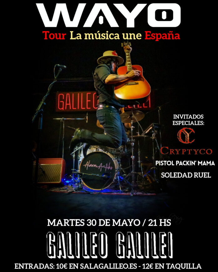 Poco a poco se acerca el momento de vivir en primera persona el concierto de Wayo en Madrid. Una ocasión única de disfrutar de un músico especial y de una propuesta en directo que te engancha desde el primer acorde. El próximo 30 de mayo en la sala Galileo Galilei (C/Galileo 100, Metro Islas Filipinas L7 o Metro Canal L2) Wayo pondrá en liza los temas de su trabajo ¨Diario de un Caminante¨ . Para una noche tan especial, Wayo se rodeara de grande amigos sobre el escenario. De tal manera disfrutaremos de Pistol Packin´Mama, Cryptyco y Soledad Ruel, tres proyectos muy diferentes pero todos ellos cargados de una fuerza y calidad únicas. Las entradas están a la venta en el siguiente enlace.