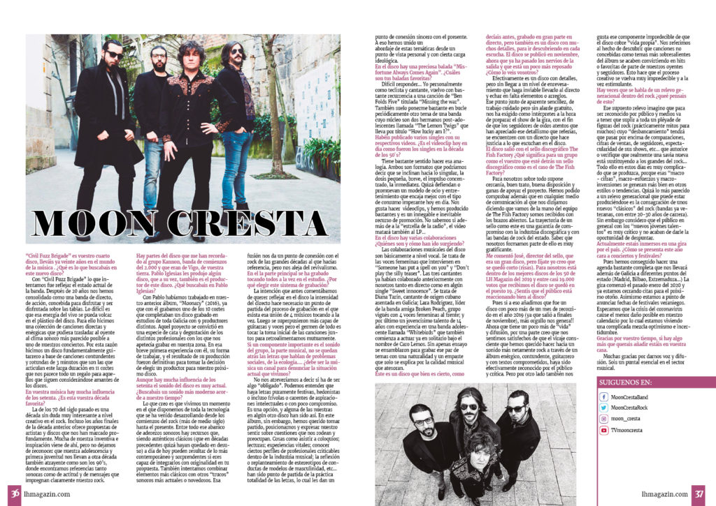 Con “Civil Fuzz Brigade” lo que intentamos fue reflejar el estado actual de la banda. Después de 20 años nos hemos consolidado como una banda de directo, de acción, concebida para disfrutar y ser disfrutada sobre las tablas. Lo difícil es que esa energía del vivo se pueda volcar en el plástico del disco. Para ello hicimos una colección de canciones directas y enérgicas que pudiera trasladar al oyente al clima sonoro más parecido posible a uno de nuestros conciertos. Por esta razón hicimos un disco fundamentalmente guitarrero a base de canciones contundentes y rotundas de 3 minutos que son las que articulan este larga duración en 11 cortes que nos parece todo un regalo para aquellos que siguen considerándose amantes de los discos.