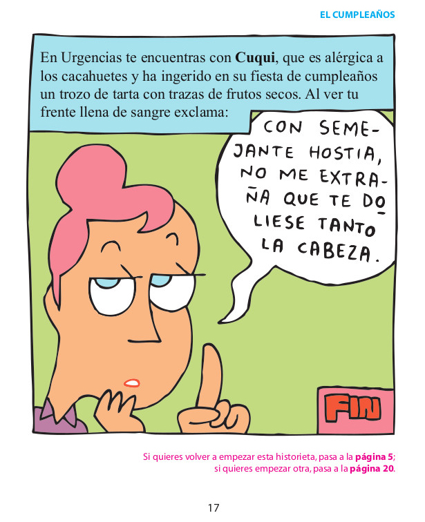 No puedes negarlo: tengas la edad que tengas, si te encuentras con este libro en cualquier librería o tienda de cómics que se precie vas a tener que acercarte a esta llamativa portada para saber quién es Cuqui, o bien si es que se trata del nuevo nombre de la legendaria criatura de la Laguna Negra. Si además tienes cierta edad, en cuanto veas ese «Elige tu propia historieta» enmarcado, un hilo de nostalgia te hará abrir sin más demora este curioso libro de tamaño ideal. Y sí, has acertado: al estilo de aquellos libros que los de más de treinta y cuarenta coleccionamos en nuestra muy lejana infancia, este «nuevo» libro de un humorista consumado como Mauro Entrialgo, nos ofrece la posibilidad de elegir el tebeo que queremos leer a través de ocurrentes elecciones dibujadas. El hilo y temor común es que, la mayoría de líos en los que empieza cada aventura, de algún modo tarde o temprano tienen que ver con tu amiga en el libro, Cuqui, de quien decidas lo que decidas no vas a poder librarte… En total son siete las historias que, dado el nivel de risa asegurada en cada una de ellas, se te harán todas ellas demasiado cortas con sus tronchantes retos: elegir entre la celebración de Cuqui o asistir al concierto de los Eucariotas en «El cumpleaños»; demostrar tus habilidades o tu cabezonería en «Consigue colgar el cuadro»; «Elige compañero de combate» para enfrentarte a un monstruo alienígena de siete metros al acabar en un universo paralelo un día que sales de marcha con Cuqui; «Consigue ser Trending Topic» en Twitter por un día; escoge bien tu destino para no sufrir «Las vacaciones del terror», «Consigue superpoderes» según el lugar que decidas visitar y «Sobrevive al verano» en la playa, en función de tu pericia para evitar las trampas mortales que puede suponer un lugar donde teóricamente relajarte.