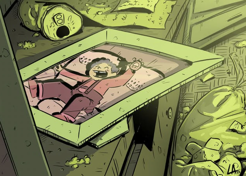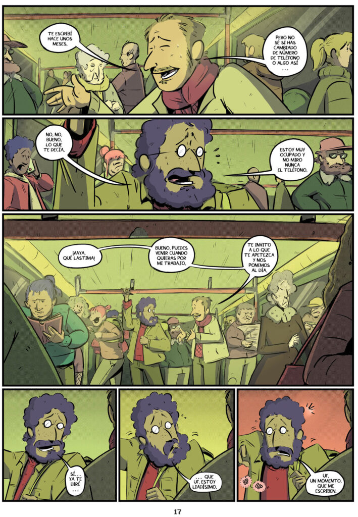 En cuanto al dibujo, sabiendo lo que tengo que contar y lo que quiero transmitir, me centré en las expresiones de los personajes. Que contaran más con sus caras que con los bocadillos. Quise mantener un estilo sencillo pero práctico, que me dejara explayarme con las facciones de los personajes pero sin la necesidad de tener mucho detalle. Y como remate el color, que con una gama cromática que apoya la narrativa, siendo el rojo el color de la vida y la esperanza, y el amarillo, el color de lo tóxico y la muerte. Durante todo el cómic veremos la lucha constante de estos dos tonos por tener el control de la paleta paralelamente de la lucha de Firmo por salvarse de su cruel destino. Conceptualmente tanto el dibujo como el color fueron cosas sencillas, pero fue lo más laborioso de hacer por la cantidad de páginas del cómic.