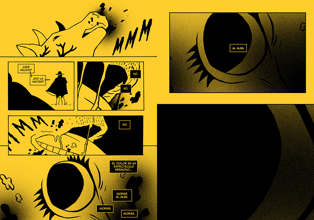 Toda la decisión del libro la hablé mucho con Jaume Bonfill, que es mi editor. Yo siempre tuve la idea de homenajear en su formato al cómic japonés, al manga, porque el cómic es en su concepto un manga: muy poca viñeta por página, una narración rápida. En realidad es muy muy manga. Entonces hablando con él yo le dije que quería un formato pequeño muy parecido al de Hierba de Keum Suk y él me dijo que sin problema. Y el tema del amarillo tuvimos muchas conversaciones con respecto a este tema porque yo en principio quería que el cómic empezara en amarillo y terminara en blanco, porque la idea era hacer alusión a que se acaba la sequía. Como técnicamente era muy complejo seguimos hablando y llegamos a la conclusión de que igual lo mejor era hacerlo todo en amarillo porque le daba un rollo más al estilo de las revistas japonesas como el Shonen Jump y todas esas, que tienen papeles de colores muy baratos y me hacia gracia homenajear eso y luego, desde el punto de vista conceptual, como aludiendo al campo charro, a la sequía y a todo eso. Fue un proceso muy de la mano con él y me gustó mucho porque cuando trabajas de la mano con un editor que entiende y que respeta mucho el sentido de la obra, como que lo compacta mucho.