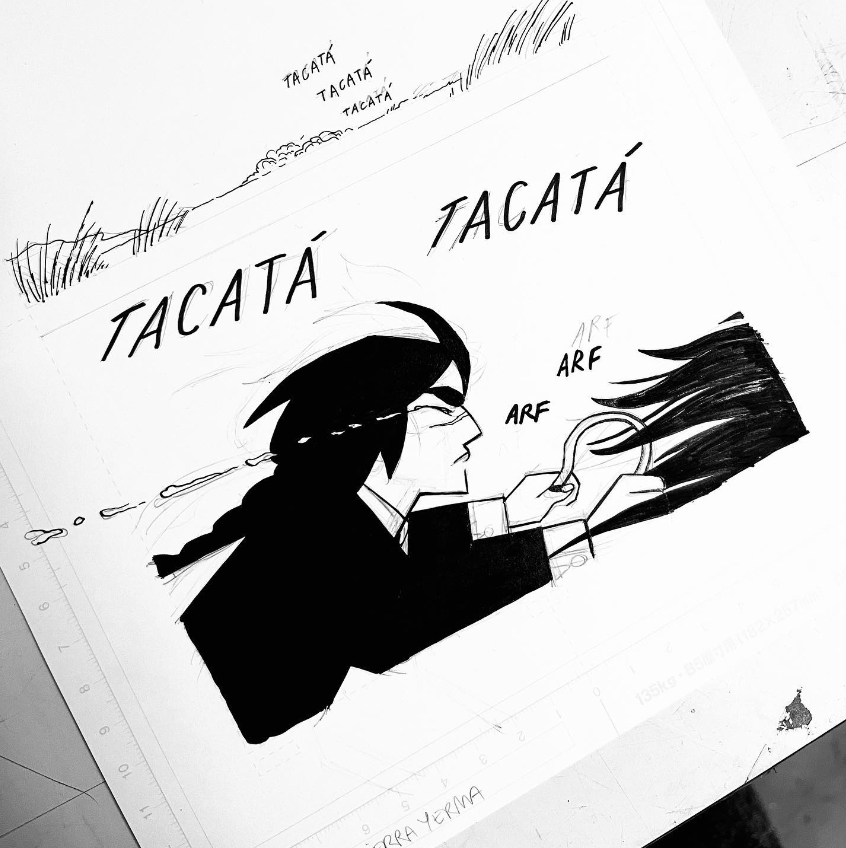 Cuando estaba haciendo el guión me dio una especie de crisis con el final, que en principio iba a ser mucho más de acción, de tiroteos y pensé que no era el final que le pegaba a la obra. Le di muchas vueltas, tuve como una crisis justo cuando lo estaba dibujando y lo reescribí. Pero ¿sabes qué? Que cuanto más pasa el tiempo y cuantos más cómics hago, me estoy dando cuenta de que el proceso creativo es mucho más orgánico y más vivo de lo que yo pensaba, osea que no son espacio estancos: no es guión, story, dibujos… sino que de repente estás haciendo una página y te das cuenta de que la narración te pide una página más o estás viendo que hay una escena que te sobra. Incluso en el momento de escribir los diálogos, que es lo último que pongo, porque voy siguiendo el guión que he hecho y luego lo paso al ordenador y ya en el ordenador pongo los bocadillos. Cuando estaba en esa parte del proceso me pasaba un poco lo mismo, me asombraba de la magia que hay en el proceso creativo, como de ver que de repente la escena cambia o que aprovechaba las viñetas y cambiaba los diálogos. Había cosas ahí como muy destinadas a cambiarse, pero de forma como muy natural. Y evidentemente muchísima inseguridad, porque todo proceso creativo lleva la toma de decisiones y hay algunas que igual te siguen dejando un poco de inseguridad.
