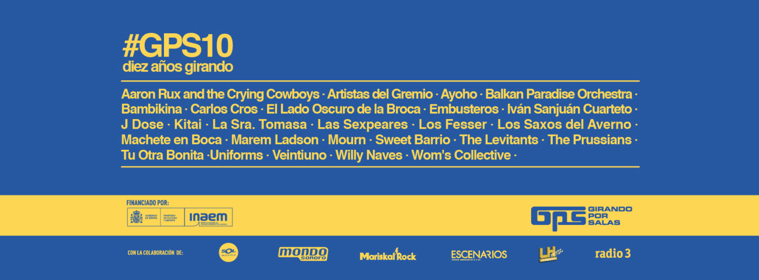 Un total de 26 grupos y solistas, de variados estilos (jazz, pop, hip-hop, músicas del mundo, rock, soul, canción de autor…) son los seleccionados para la edición #GPS10 de Girando Por Salas, iniciativa del Instituto Nacional de las Artes Escénicas y de la Música (INAEM) del Ministerio de Cultura y Deporte, siendo entidad colaboradora la Federación Coordinadora del Circuito de Músicas Populares (FCMP), formada por las siguientes asociaciones profesionales: ACCES (Asociación Estatal de Salas de Música en Directo), APM (Asociación de Promotores Musicales), ARC (Associació de Representants, Promotors i Managers de Catalunya), ARTE (Asociación de Representantes Técnicos del Espectáculo), MUSICAT (Associació Professional de Músics de Catalunya), PROMUSICAE (Productores de Música de España) y UFI (Unión Fonográfica Independiente).