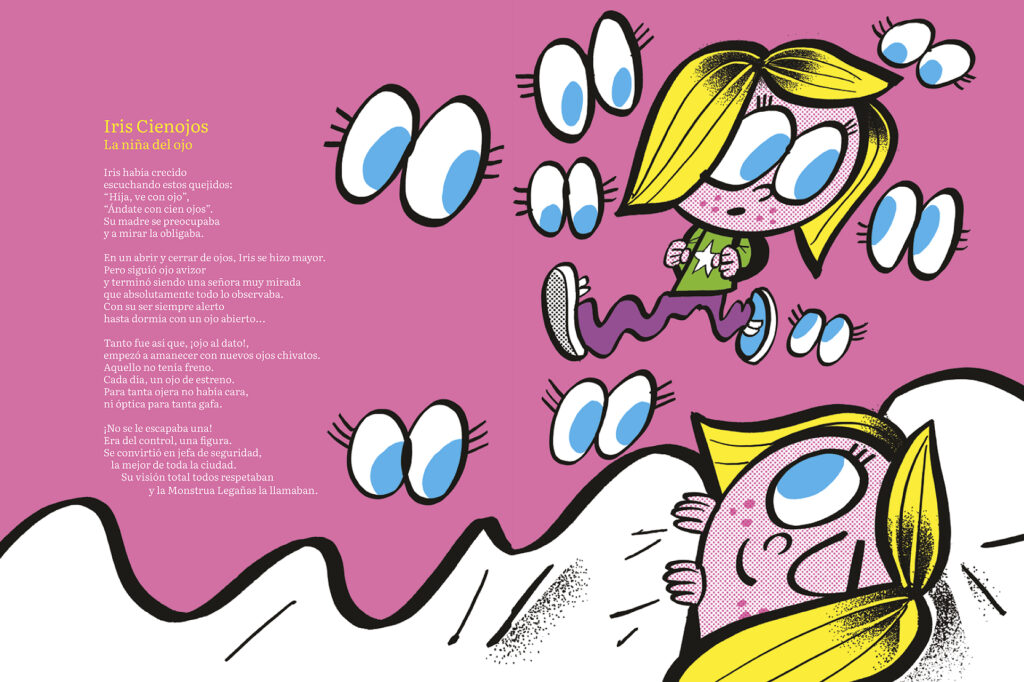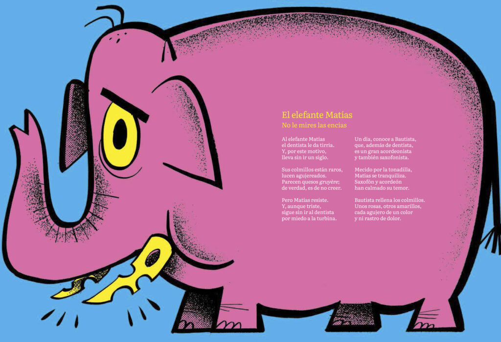 ¡Tengo un miedo! es un libro ideal para adultos y medianos, porque mientras tú disfrutarás de los dobles sentidos de estos poemas y rimas para espantar miedos y grimas, las vistosas dobles páginas ilustradas, pero sobre todo coloreadas por el talento pop de Lorenzo Montatore harán las delicias de quien te escuche leer esas rimas. En total son 15 retratos de 15 personajes fantásticos en todos los sentidos y que, con inevitable humor, afrontan cada uno su preocupación más horrorosa, su miedo particular. Sin duda es un cuento ilustrado para todos los sentidos, si exceptuamos que por muy omnívoros que seamos, el papel de colores aún no forma parte de ninguna dieta… aunque no será por las ganas de masticar esos tremendos rosas color chicle con los que Montatore inunda todas las páginas, recordándonos a su manera que la vida siempre puede ser de color rosa si simplemente apreciamos lo que tenemos delante y superamos nuestros miedos.