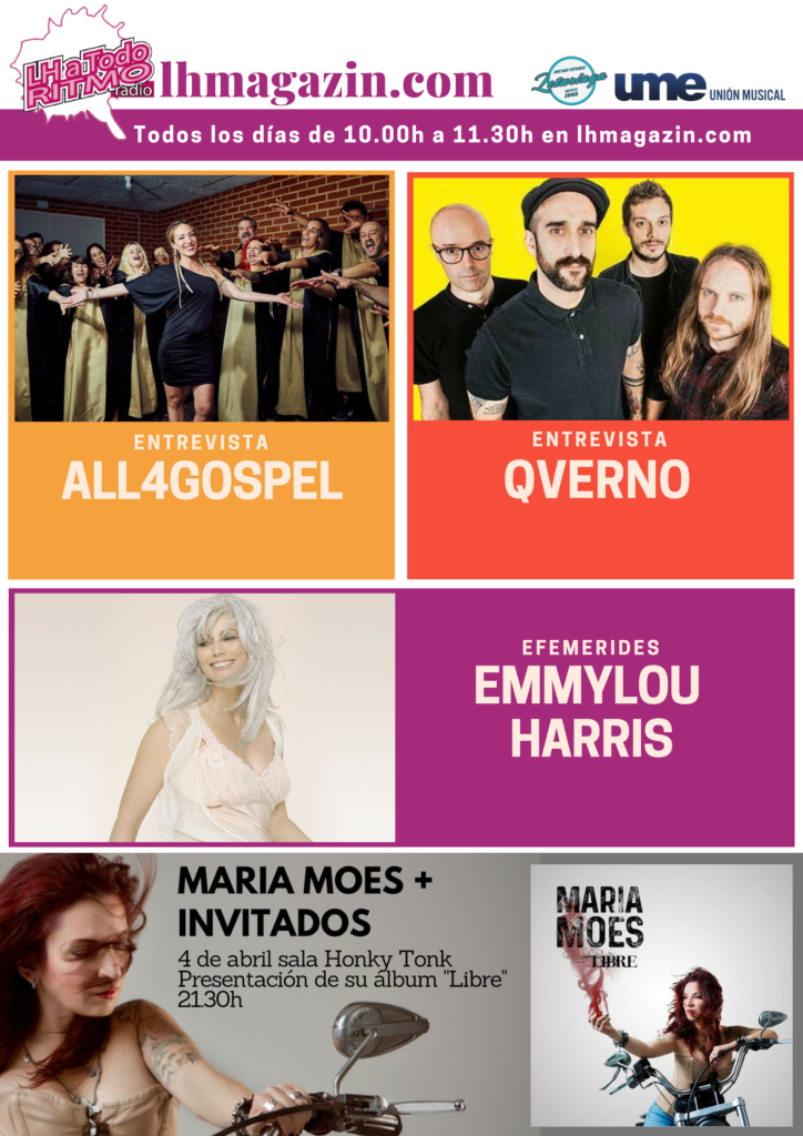 - Jueves 4 de abril sala Honky Tonk Maria Moes más invitados Carlos Pina, Juan Marquez, Juan Olmos, José Bulevar… 10€ + CD