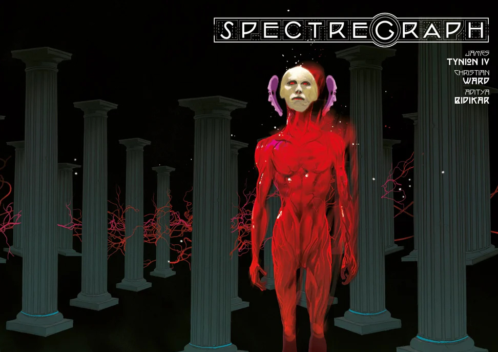 Sobre su visión particular sobre lo que él imagina como «fantasmas», el guionista confirma doblemente una reconocida referencia común: «en cuanto a nuestros fantasmas, volví a mi pasión por Clive Barker, cuyos mundos y monstruos son exóticos y aterradores a partes iguales. Quería esa misma tensión aquí. Quería explorar al máximo lo que un fantasma podría ser». Y lo cierto es que Tynion se demuestra resuelto ofreciéndonos un relato propio que lo cierto es que, barriendo la diferencia entre medios artísticos, supera con su propuesta la aburrida última aportación a ese universo de «la nueva carne» creado por el genial Clive Barker y que en tan pobre lugar dejó la aburridísima y anodina Hellraiser de 2022. Spectregraph es lo contrario a aburrida y, no sé si con la mirada puesta en el horizonte audiovisual, lo que Christian Ward ha sido capaz de imaginar y sacar de su mente hasta convertirlo en pesadillas dibujadas te hace pensar si serás capaz de pasar a la siguiente página y afrontar la visión de seres que, en claro homenaje a los cenobitas, nos ofrecen una visión de verdad original al mundo del terror.