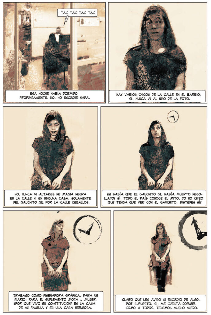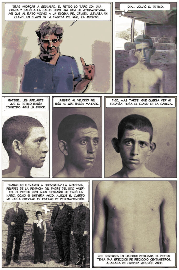 Pablito clavó un clavito recupera a través del «Buenos Aires Mistery Tour» una escalofriante historia REAL que conmocionó a la ciudad de Buenos Aires a principios del siglo XX. Cayetano Santos Godino, conocido como el «Petiso Orejudo», nos lleva a la peor versión de lo que producen nuestras sociedades y las ciudades: asesinos en serie. Lo curioso y lo peor, como siempre ocurre en estos casos en que la realidad supera toda ficción, es que este sádico niño asesino de niños ya había sido acusado de incendiar varios edificios antes de cumplir 9 años. A medida que creció, sus actos resultaron del todo incomprensibles y grotescos en aquella orgullosa Argentina del centenario de los palacetes y del despilfarro. La autora hila aquí sibilinamente el relato del guía que nos relata la vida y obra del cruel asesino con la de uno de los viajeros al Buenos Aires más oscuro: único personaje masculino con entidad en el libro, que resulta ser padre primerizo muy poco convencido de su decisión y mucho más de la oscuridad desatada del Petiso… Lucas Nine borda aquí un escalofriante desafío visual en el que recuerda los momentos más brillantes del binomio Neil Gaiman-Dave McKean de los años 90, mezclando imágenes de archivo y fotografías del caso del niño asesino en collage con ilustraciones ofreciendo su horripilante versión de algunos de sus crímenes.