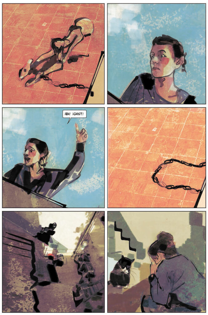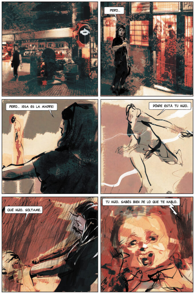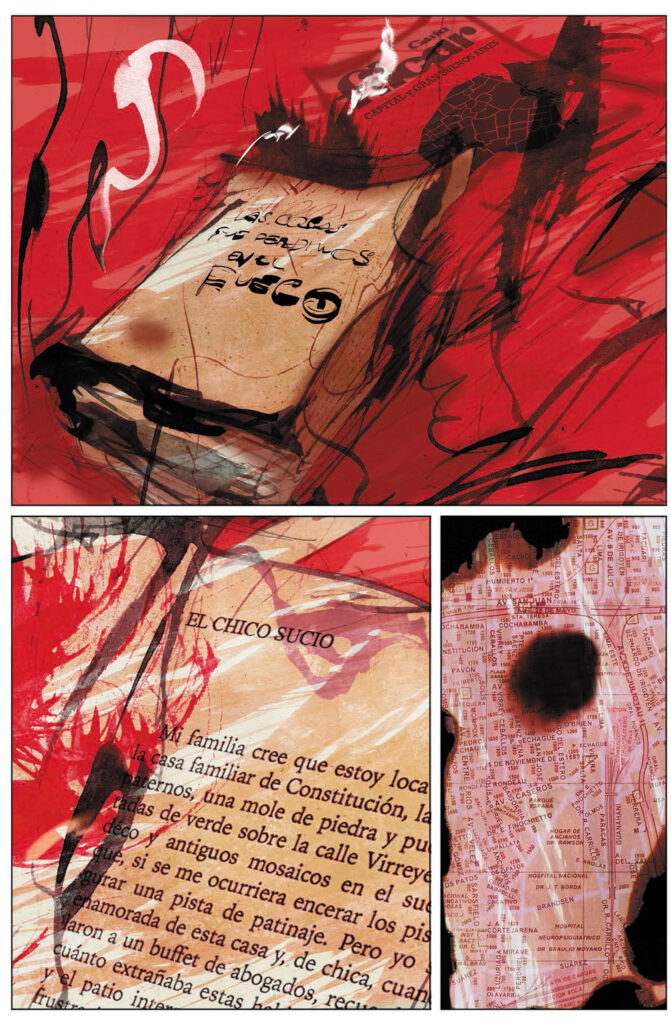 Para esta versión gráfica de Las cosas que perdimos en el fuego, Lucas Nine ha seleccionado cuatro relatos crudos, duros y, sobre todo, sorprendentes. Entrelazados todos por fragmentos rotos de un callejero de la ciudad de Buenos Aires, todas las historias despiertan miedos que ni siquiera sabíamos que pudiesen existir dentro de las ciudades. A las afueras, o en algún rincón olvidado, un coche abandonado comienza a arder en mitad de la noche con una mujer dentro, sentada al volante, dejándose llevar por un final horrible que, en realidad, quien sabe, quizás sea la única escapatoria a algo peor… Junto a ella descansa, antes de ser consumido por las llamas, el libro con el título que hoy venimos a recomendarte si eres de estómago fuerte y te atreves a meterte donde la salida no es para nada evidente. Ya desde el inicio, Lucas Nine opta por una versión completamente expresionista para dibujar tanto como sugerir. Y allí, nítido entre las llamas, leemos el título del primer relato de Las cosas que perdimos en el fuego: El chico sucio.