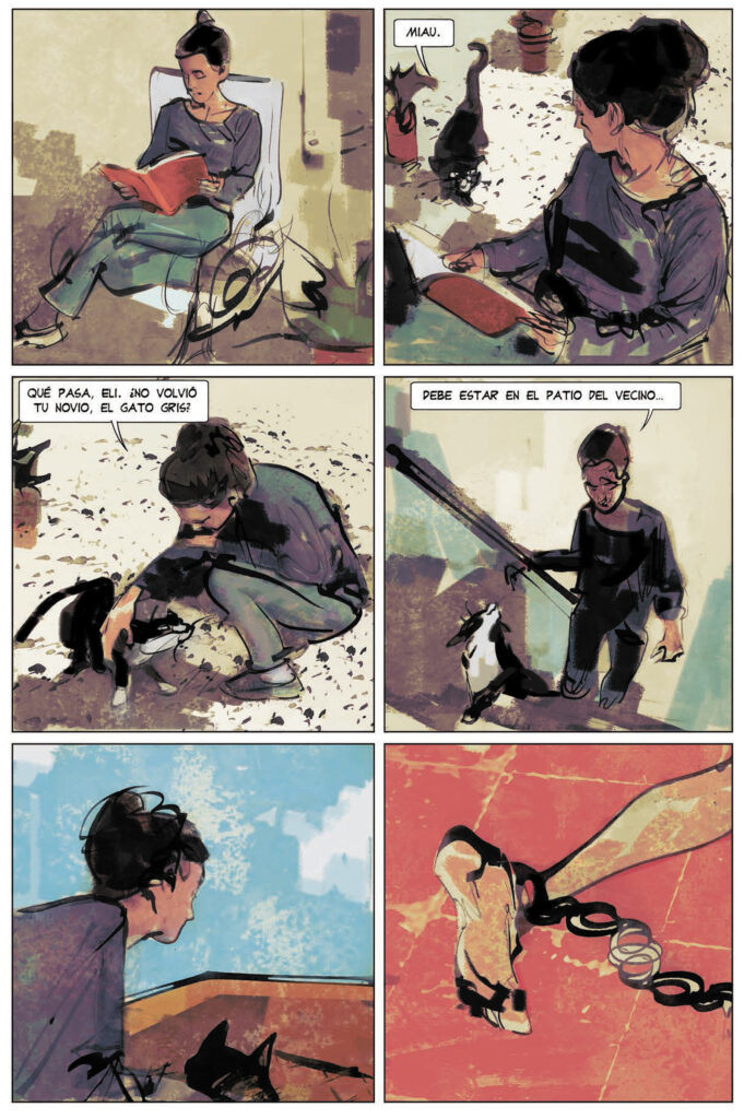 Y ya con toda nuestra atención ante cada siguiente página, imposible dormirse o despegarnos del libro, llegan El patio del vecino y Bajo el agua negra y nos arrastran a universos propios más inquietantes aún. En ellos, el arte indiscutible y veterano de quien ha sido dibujante, ilustrador, historietista y director de cine de animación, se pone al servicio de aplicar mil y una técnicas para hacernos sentir incómodos e inquietarnos con dibujos descolocados, difusos, que nos hablan de los peligros de lo que vive dentro de algunas mentes, como es el caso de la protagonista de El patio del vecino, una asistente social que acaba de perder su trabajo por anteponer la diversión con sus compañeros de trabajo a su misión en un hogar para menores tutelados. Tratando de recuperarse y encontrarle sentido a su vida, mudarse a una casa cuyos misteriosos vecinos le recuerdan una y otra vez sus errores, la lleva al extremo de afrontar su culpa allí donde se cruzan los límites de lo real y, quizás, la verdadera locura.