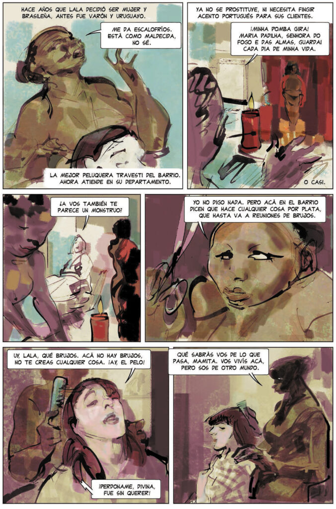 Pero el plato fuerte es el último relato, Bajo el agua negra. Y sí, cualquier oscuro universo de profundidades viscosas que despierte el título en tu mente es real pero autora y dibujante fueron mucho más lejos. Este último y breve cuento ilustrado comienza pareciendo un evidente homenaje a las mejores historias policiacas ambientadas en los mundos de Lovecraft, para convertirse después en una historia con mayúsculas donde, al más puro estilo del autor homenajeado, lo que nos sugiere se extiende en nuestra mente mucho más allá del punto en que termina el relato. Marina es una fiscal decidida a sacar a la luz lo que ocurre de verdad en la Villa, un sucio suburbio delimitado por un riachuelo contaminado en el que, además, han «muerto» ahogados varios jóvenes. Un lugar al que nadie quiere entrar y que la policía querría ver convertido en cenizas, encierra algo que la protagonista no puede dejar pasar y que la llevará a ser capaz de entrar en ese infecto poblado al que rodea un río podrido que, en realidad, esconde mucho más que seguidores de cultos afrobrasileños o santos personales…