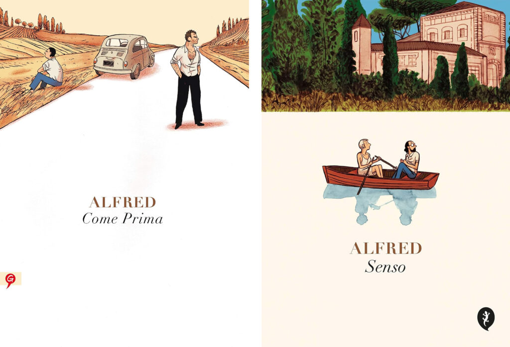 Para suerte de quienes admiramos su forma de contar historias dibujando, en esos cuadernos de recuerdos y posiblemente cientos de bocetos aguardaban más historias avocadas al mismo escenario: «Un libro a menudo lleva dentro las semillas del siguiente -apunta Alfred–, sin que nos demos cuenta al principio… Fue una vez terminado Come Prima que sentí la necesidad de continuar el viaje en lo que llamo mi “Italia emocional”. Había multitud de elementos y recuerdos en mis notas que no tenían cabida en Come Prima pero que ya parecían iniciar otra historia, la que se convirtió en Senso«. Con los mismos tonos cálidos que describen a la perfección el sur de Italia y casi nos hacen sentir los lugares que pisan sus personajes, Senso es casi la trasposición a cómic de un libreto teatral (disciplina artística en la que despuntó su padre) contándonos la historia de cómo un hombre (que no estaba invitado) y una mujer (que no quería asistir) se conocen por casualidad durante una boda en un antiguo hotel del sur de Italia.