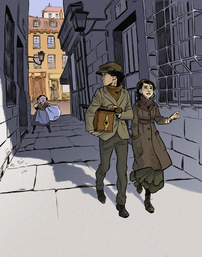 Montse Martín: Creo que ubicar la tienda en Madrid era algo que nos hacía ilusión a ambas, como madrileñas que somos, y, confieso mi ignorancia, yo no conozco ningún cómic situado en la capital… así que parecía dar un pequeño toque novedoso a la obra. Y por mi parte, intentar reproducir ese Madrid de principios del siglo XX, ha sido un reto y un aprendizaje continuo, me motivaba mucho reconocer en viejas fotos un entorno conocido, con el que me sentía muy identificada y muy cómoda, a pesar de las grandes diferencias entre la ciudad del pasado y la actual.