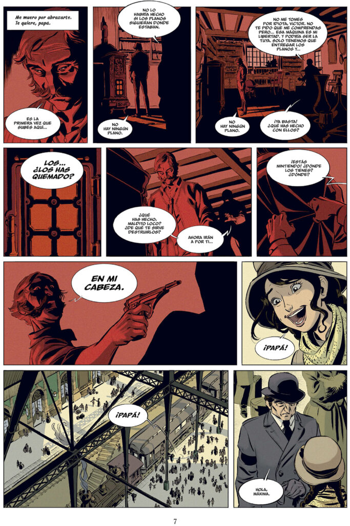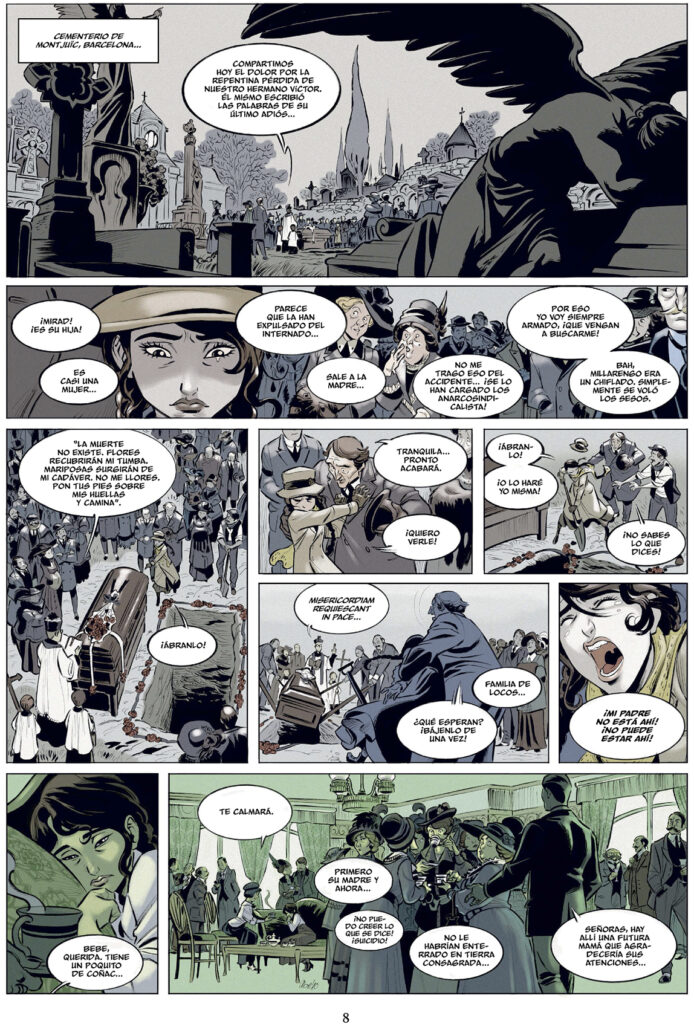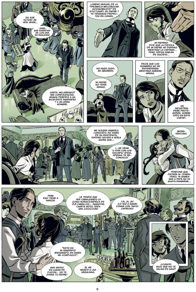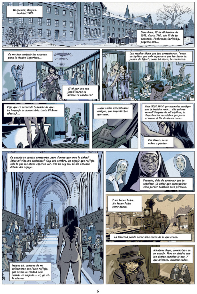Montse Martín: Es muy complicado hablar de influencias para mi: hay demasiados autores que me fascinan y de los que aprendo todos los días. Por supuesto, la portada debía ser estilo modernista, que se daba mucho en la España de esa época, aunque en el resto de Europa empezaba a a abandonarse, no obstante. Pero queríamos ser un poquito fieles también en ese aspecto, y es que es un estilo fascinante., ya sea en pintura, cartelismo, escultura o arquitectura… Y hablando del interior, de las páginas propiamente dichas, me es inevitable quitarme todo lo aprendido en la animación, que creo que se percibe bastante bien, tanto en el dibujo en sí como en la realización, hecha en gran parte por Teresa, que es dibujante de animación también… Pero sigo el aire (bueno, lo intento con grandes dificultades…) de los dibujantes que leí durante mis años “mozos”, que fueron los que despuntaron sobre todo en los ochenta y noventa: Font, Altuna, Rosinski, Pellejero, Carlos Giménez… en fin, yo era lectora habitual de Cimoc. Y ahora los releo continuamente y siempre observo cosas nuevas.