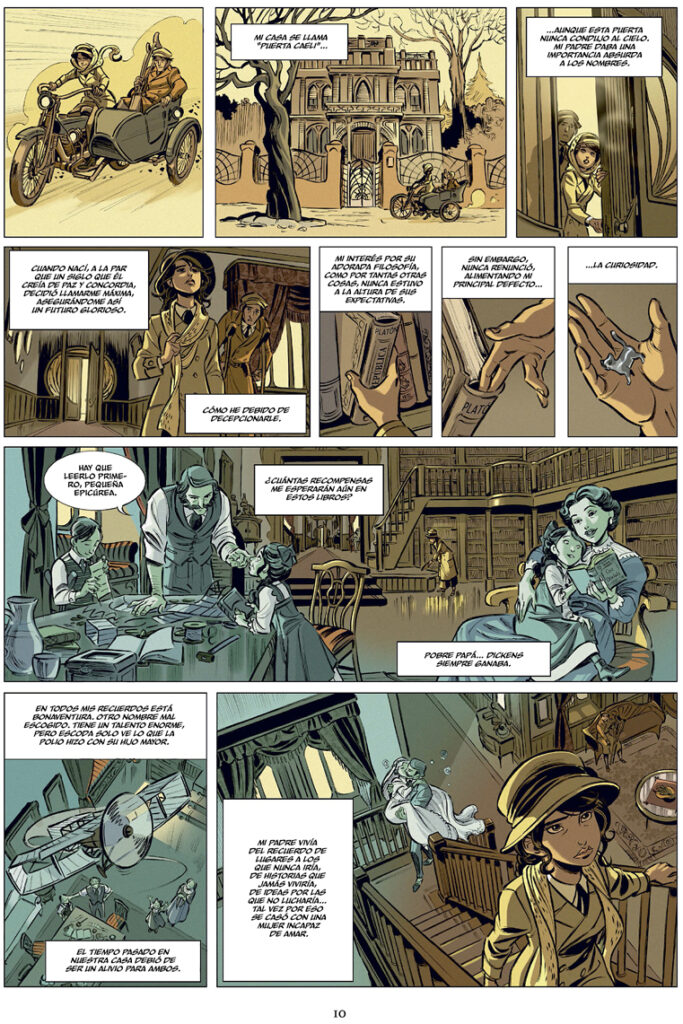 Montse Martín: Reconozco mi total ignorancia frente al trabajo de Tardi: no he leído Adéle Blanc-Sec. A cambio, he leído y disfrutado con Dieter Lumpen, (Pellejero y Zetner), Taxi y Jon Rohner (Alfonso Font)… Aunque me encantan las películas de Indiana Jones y el espíritu aventurero y la intriga que destilan; son divertidísimas. Se podría ver, tal vez, a Max como una especie de Indiana en femenino, aunque mucho más seria y austera de carácter, y sus motivaciones personales son distintas. El guión de Teresa ha profundizado más en la época que le ha tocado vivir a nuestra protagonista, y es real en ese aspecto, ha procurado no sacrificar la realidad histórica en favor de la aventura o los enigmas relacionados con los objetos misteriosos que busca.
