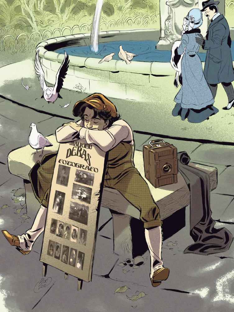 Montse Martín: Ah… ambas cosa, se padece y se disfruta. Es la primera vez que cuido tanto esos detalles, que me es necesario identificar un entorno real, y el trabajo de documentación ha sido muy intenso, aunque, como siempre, finalmente tienes que hacer una criba gigantesca y quedarte con lo esencial. Creo que esa es la parte realmente dura: decidir qué muestras y qué te guardas. Y no poder dar un paso sin realizar una búsqueda previa. Me ha quedado la sensación de que tenía una idea errónea de la vida de la gente, de la conformación de las ciudades… al finalizar el tebeo, he constatado que las costumbres eran mucho más relajadas de lo que me parecía en un principio, tan acostumbrada a esas fotos de estudio que todos tenemos de nuestros abuelos o bisabuelos, normalmente vestidos de negro, tiesos e incómodos, completamente desacostumbrados a que les fotografíen… Hay que aprender a observar el detalle, la anécdota de cada foto antigua que encuentras. Y, asombrosamente, no sólo hay fotos en blanco y negro, he podido encontrar, en el Archivo fotográfico de la Comunidad de Madrid, fotos de 1915 en color, para mi sorpresa. Y te aseguro que ver esas fotos en color te cambia por completo la idea que puedas tener de esa época.