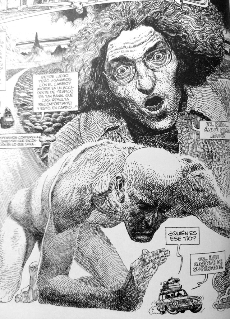 Habiendo tenido la suerte de poder ver en persona en la exposición itinerante sobre el cómic de todos los tiempos que la Fundación La Caixa llevó por toda la península, esta enorme plancha que aquí supuso una de las viñetas a doble página más brutales de la historia del cómic, es motivo suficiente para releer o volver a recrearse en las ilustraciones de «Arzach» una y mil veces.