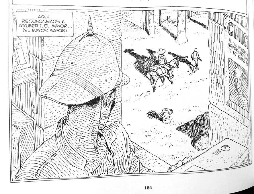 El momento en que llegues al enorme tomo de Obra hermética , te será inevitable olvidarte de su portada. Después, pese a su enorme tamaño y volumen, te darás cuenta de que es manejable y que la tapa dura y la elección del papel convierte en sobresaliente un trabajo de edición e impresión impecables, donde destacan por supuesto las muchas historietas y páginas a color (en especial las inolvidables planchas de Arzach) pero donde sobresale y destaca el la impecable labor del dibujo en blanco y negro de un autor que sólo cedió a la tecnología en la ultimísima etapa de su obra. Revisadas las historias y comparadas con otras ediciones, éste, como todos deberían serlo, es uno de esos libros donde hay que agradecer y resaltar el trabajo en la traducción de Carlos Mayor, quien abiertamente ha declarado que Obra hermética es «el tebeo más difícil que he traducido en toda mi vida. Escritura automática, términos inventados, referencias a gogó, surrealismo… Juegos, rejuegos y requetejuegos. Son 500 paginitas de nada con todo el Garaje Hermético, las aventuras del mayor Fatal, el cazador cazado, Faragonescia, un posfacio completísimo de Claude Ecken…»