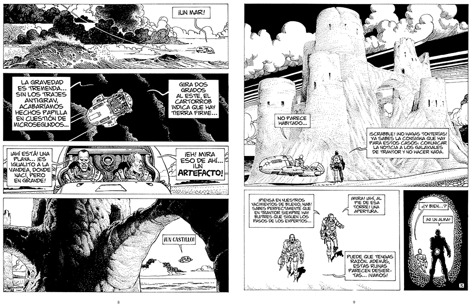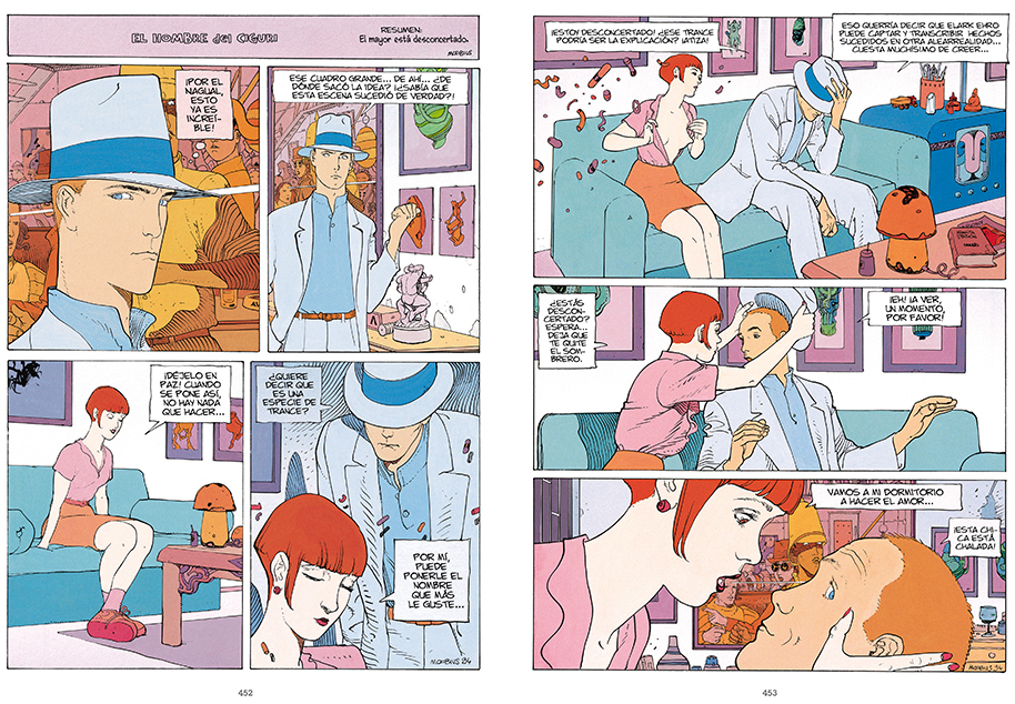 Obra hermética supone poder disfrutar, tocar y recrearse en un formato digno de una parte de la obra y trayectoria de Moebius verdaderamente COMPLETA como nada que se haya editado nunca antes aquí. Enciclopedia visual instantánea del artista francés, completistas, coleccionistas, devotos, fanáticos y practicantes del culto a la línea clara y a una forma de entender el cómic que nunca se repetirá, no tienen que ir más lejos para disfrutar del verdadero Grial Gráfico. Porque fue para todas estas páginas que ahora podemos leer reunidas, que Giraud o Gir decidió superarse como dibujante, igual que sus compañeros, revolucionando en el intento la mayor parte de mecanismos narrativos del cómic conocido en aquella lejana década de los 70. Claude Ecken, notable escritor de ciencia ficción con cerca de una veintena de obras, novelas, libros ilustrados e incluso cómics, pone claramente de manifiesto en el completísimo posfacio narrado a este libro, con el título de «Los tres pilares de la creación» como «todos los artistas de esa generación surgida en Francia a finales de los sesenta eran presa de una ambición desmesurada que los impulsaba a superarse y a enfrentarse». En muchos casos la mayor ambición de este conjunto de artistas perfeccionistas era llevar a la historieta a un respetable nivel superior, al del Noveno Arte. Al de demostrar cómo estirar los límites de la narración a extremos nunca antes alcanzados. «Sobre todo me considero dibujante por encima de todo -afirmaba Moebius en la entrevista que conseguimos hacerle para la versión impresa de LH-. Sin embargo como dibujante me puedo permitir dotar a mis trabajos de una calidad sencilla o de un toque que me acerque a esa cofradía (risas) exclusiva del Arte con mayúsculas. Son nociones muy fluctuantes y nada precisas. Son clasificaciones con las que tener cuidado, desde luego«.
