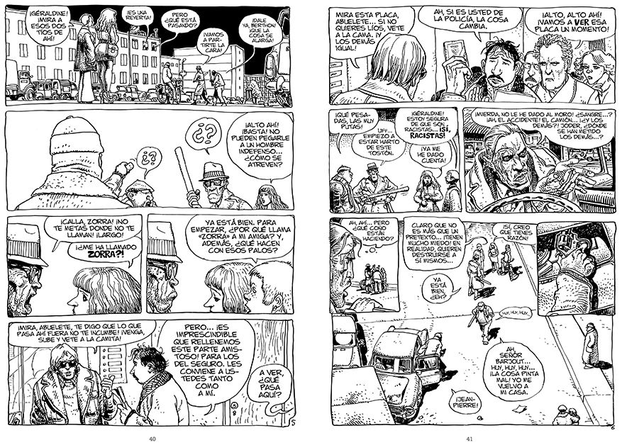Un día, me enseñó lo que dibujaba: era el story-board de «The long tomorrow». Una historieta policíaca clásica, pero situada en el futuro. Me entusiasmó. Cuando los europeos se lanzan a ese tipo de pastiche, el resultado nunca es del todo satisfactorio: a los franceses les queda demasiado a la francesa, a los italianos demasiado a la italiana.. Tenía ante mis ojos un pastiche que era más original que el propio original. Creyendo parodiar, Dan seguía la tradición. Como la historia era muy potente, enseguida presentí que me permitiría jugar gráficamente, con toda libertad, sin artificios convencionales, para concentrarme constantemente en un sujeto fluctuante. El traje de Pete Club, por ejemplo, está en el límite de lo ridículo, muy lejos de la tradición la gabardina a lo Bogart Y lo mismo ocurre con la mayor parte de los elementos visuales. Seguí escrupulosamente el guion de Dan. Me gustaría que un día se publicasen las dos versiones, una al lado de la otra. Como la historieta le gustó a todo el mundo, le pedí una continuación, pero no me atrajo. Era simplemente una aventurita y nunca la he dibujado. Tras el fracaso de Dune, Dan me llamó para Alien… pero ésa es otra historia…»