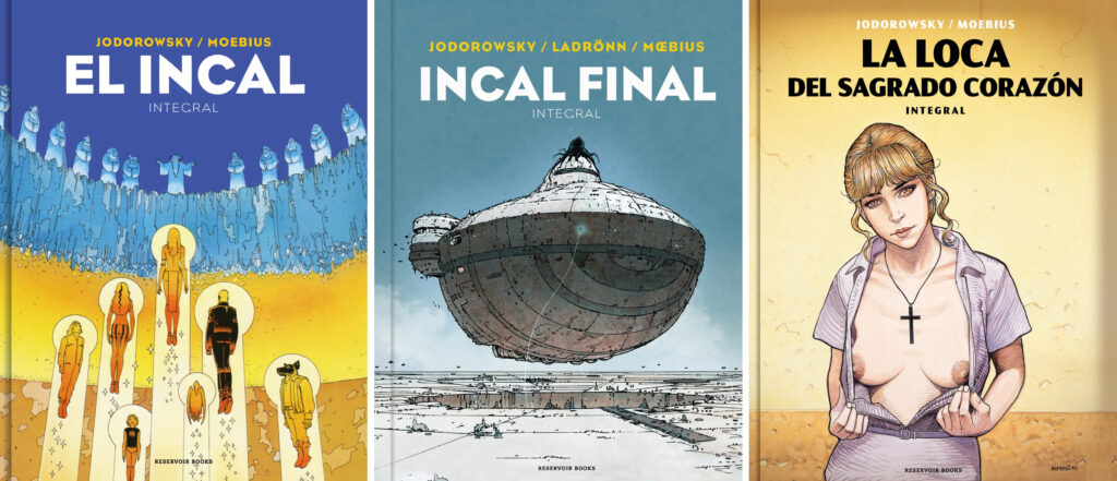 Y es así que llegamos a esta Obra hermética, editada realmente a lo grande por Reservoir Books. Estamos ante el libro del año. En formato (22,7 x 4,3 x 29,6 cm.), en contenido (480 páginas desbordadas de dibujos de Moebius) y en importancia al haber sido capaces, después de sus memorables y cuidadas ediciones integrales de El Incal, Incal final y La loca del Sagrado Corazón, de reunir en un solo tomo y en orden cronológico todas las historietas personales de Moebius precursoras o participes de la época dorada de la revista Metal Hurlant (1975-1987), de la que fue cofundador junto a Jean-Pierre Dionnet y Philippe Druillet, quienes se constituirían además con ese legendario nombre colectivo de Les Humanoïdes Associés.