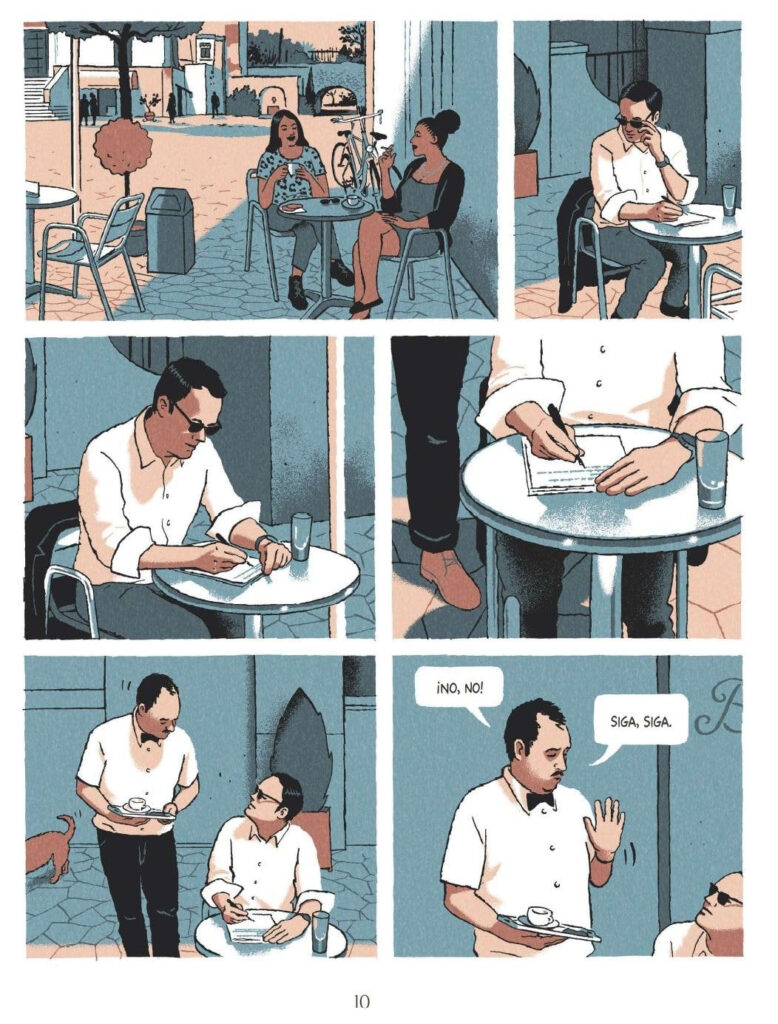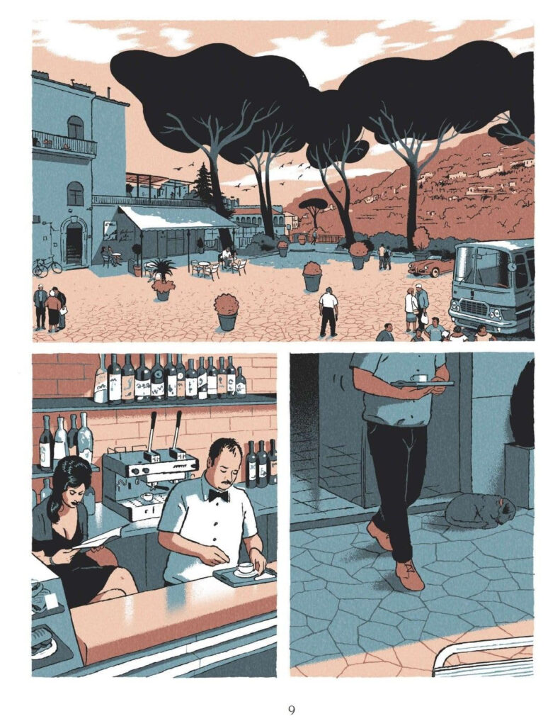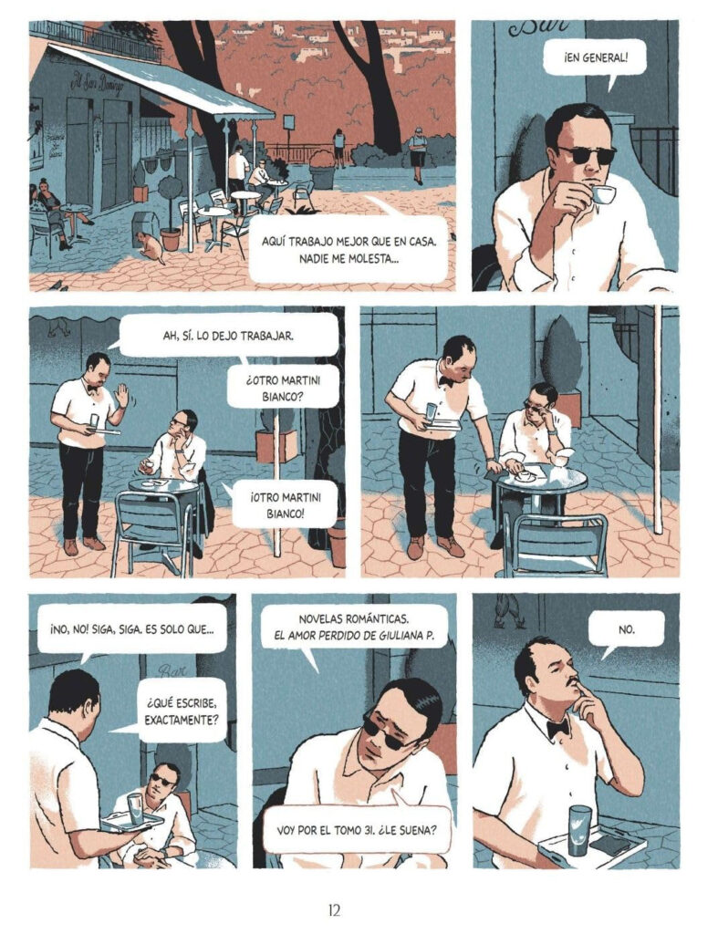 Como si del propio Zidrou se tratara, buscando inspiración en la tranquilidad de esas terrazas de pequeños pueblos italianos donde parece vivir la luz tamizada de los atardeceres perfectos, «El asesino cuyo nombre conozco» sirve como prólogo al resto de historias en una juego metalingüístico donde nos sentamos junto a un popular autor de novelas románticas, concretamente el tomo 31 de El amor perdido de Giuliana P. Conociendo el desenlace de una trama que este escritor nunca terminará, aún conociendo el final, desde su charla con el dueño y a la vez camarero del bar en el que escribe todas las tardes, nos dejamos caer en el resto de historias, todas diferentes en personajes, escenarios, colores e incluso forma de dibujar tantas historias de felicidad como de trágico final. «Soy un guionista instintivo -explica Zidrou–. Yo escribo primero. Luego pienso en ello (¡bueno! ¡No siempre!). Y luego me puse al servicio de David, el dibunante (es mi trabajo, de hecho) y, luego, de los distintos personajes que aparecen a lo largo de estas historias a veces tiernas, a veces más amargas».