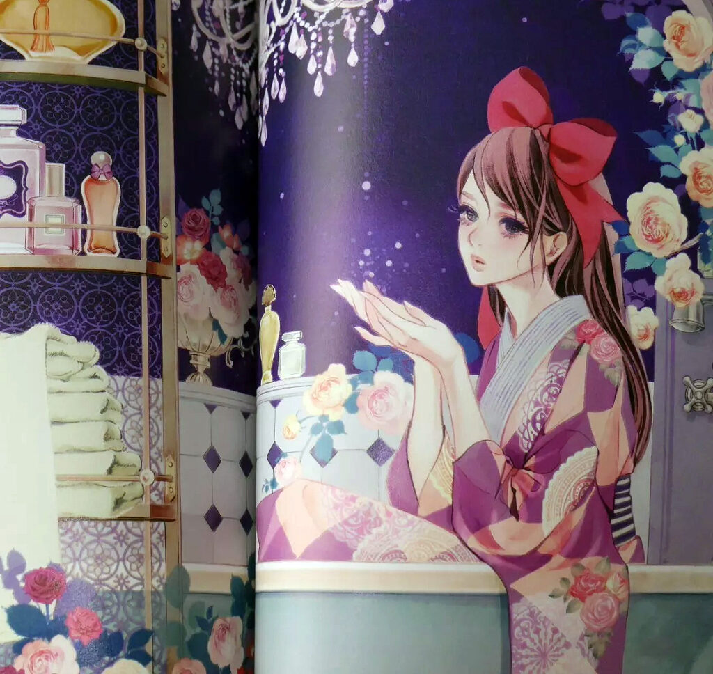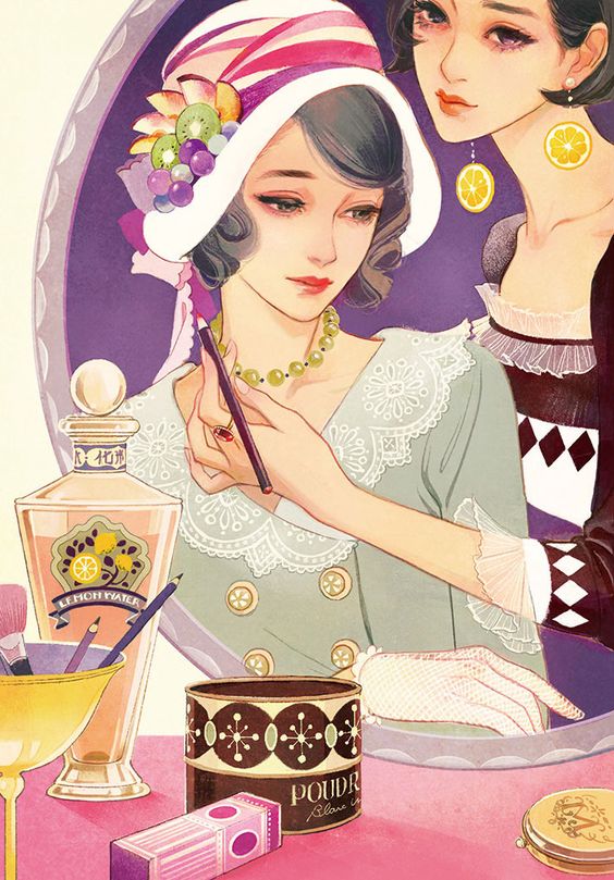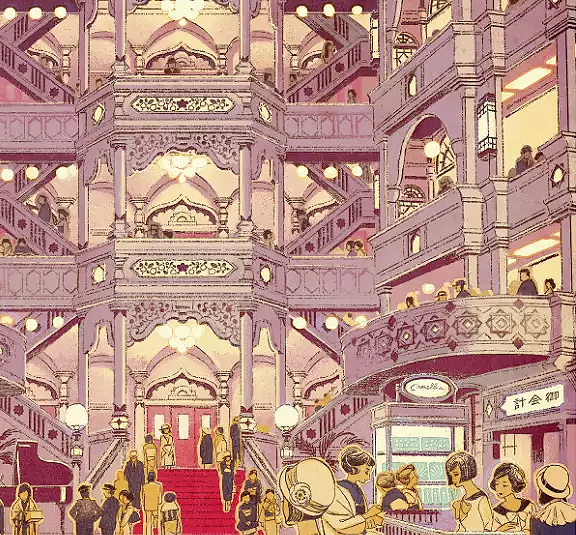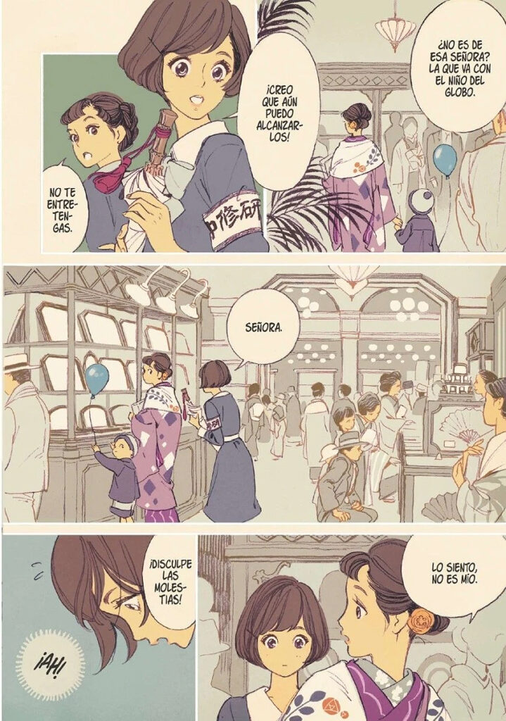 Paseando entre ilustraciones a lo largo de este pequeño gran libro editado, como decíamos, a todo color y con todo el cuidado en su edición, papel y detalles, nos sumergimos poco a poco en la mezcla que nos presenta la autora de recuerdos con una original mezcla de Modernismo teñido de influencia oriental. No es difícil hacerse una idea de las sensaciones que todavía conserva viendo sus ilustraciones: «desde la cafetería de la segunda planta, podía ver los mostradores de cosméticos y los accesorios de moda de la primera. Era una experiencia indescriptible y sin parangón. El vestíbulo del ascensor y la decoración del techo de la primera planta eran de una belleza abrumadora, y convertían la tienda en algo más que un simple centro comercial al que ir a gastar; la convertían en un lugar especial, diseñado a conciencia por y para el lujo».