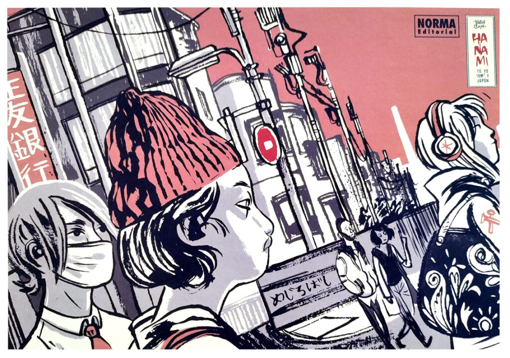 Esta semana han coincidido en nuestra guarida de viñetas dos libros bien diferentes pero con ese nexo común que ejercen la atracción por Japón y lo diferente que es una ciudad como Tokio a todo lo que conocemos. El primero es Hanami: tú, yo, 19 m2 y Japón, un personalísimo cuaderno de viajes dibujado que constituye la primera obra completa publicada por la autora Julia Cejas. Este cómic nos recibe con impresionante y llamativa portada que refleja y explica a la perfección su título, ya que el Hanami es ese esperado momento en el que florecen los cerezos en Japón, que allí es todo un evento social a nivel nacional. «El Hanami -explica Julia*–, es un especie de fiesta y experiencia que se hace cuando florece el cerezo. Por un lado está el simple hecho de observar y luego el comer y beber. Pero a nivel más global sería como observar una gran belleza. Algo muy frágil. La flor, si llueve, puede durar un día. Allí están obsesionados con ello y cuando lo vives estás tan expectante que te desinfla un poco. Pero lo cierto es que pasan luego los meses y no dejas de pensar qué bonito era y cuando será el siguiente».