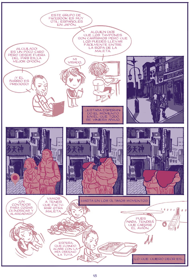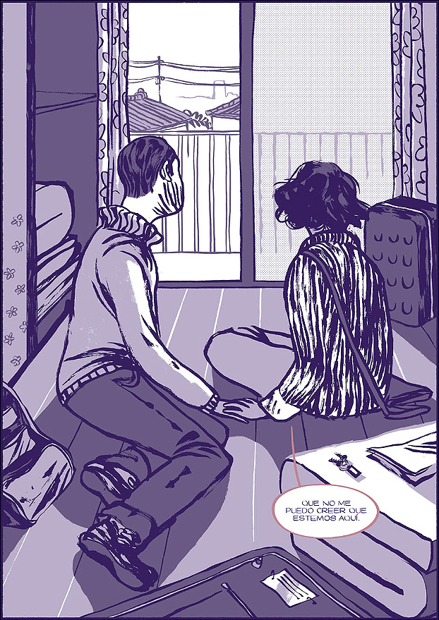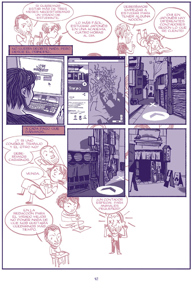 Como en todo buen diario de viajes, en el interior de Hanami: tú, yo, 19 m2 y Japón, Julia nos lo cuenta todo desde el principio a través de maravillosas viñetas en bitono: «Yo gané una beca de bastante dinero y a Marc, mi pareja, le habían despedido de su trabajo como ingeniero de caminos y le dieron su finiquito y de repente teníamos todo ese dinero y nos dijimos ‘ahora o nunca’, porque nunca íbamos a tener tanto dinero ni a ser tan libres: podíamos trabajar en cualquier sitio, no teníamos hijos, ni mascotas». Así que dicho y hecho, su pareja y ella decidieron embarcarse a la aventura de vivir durante seis inolvidables meses en Japón, esa meca de lo exótico y diferente para todo occidental que haya crecido con las innumerables dosis culturales que ese país ha sabido exportar tan bien desde hace tanto tiempo.